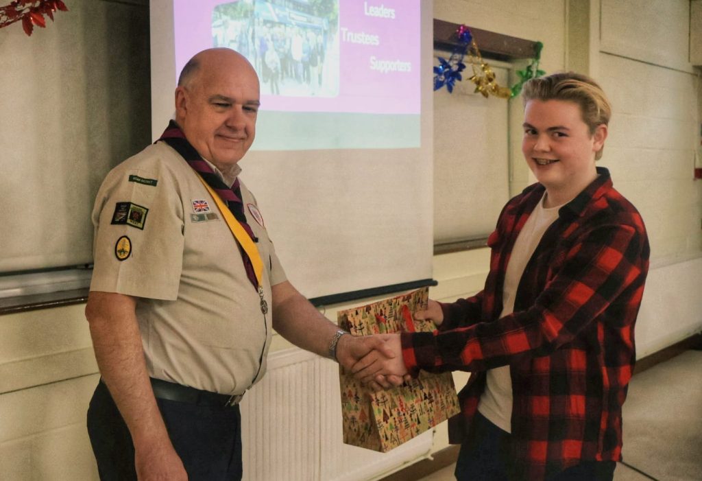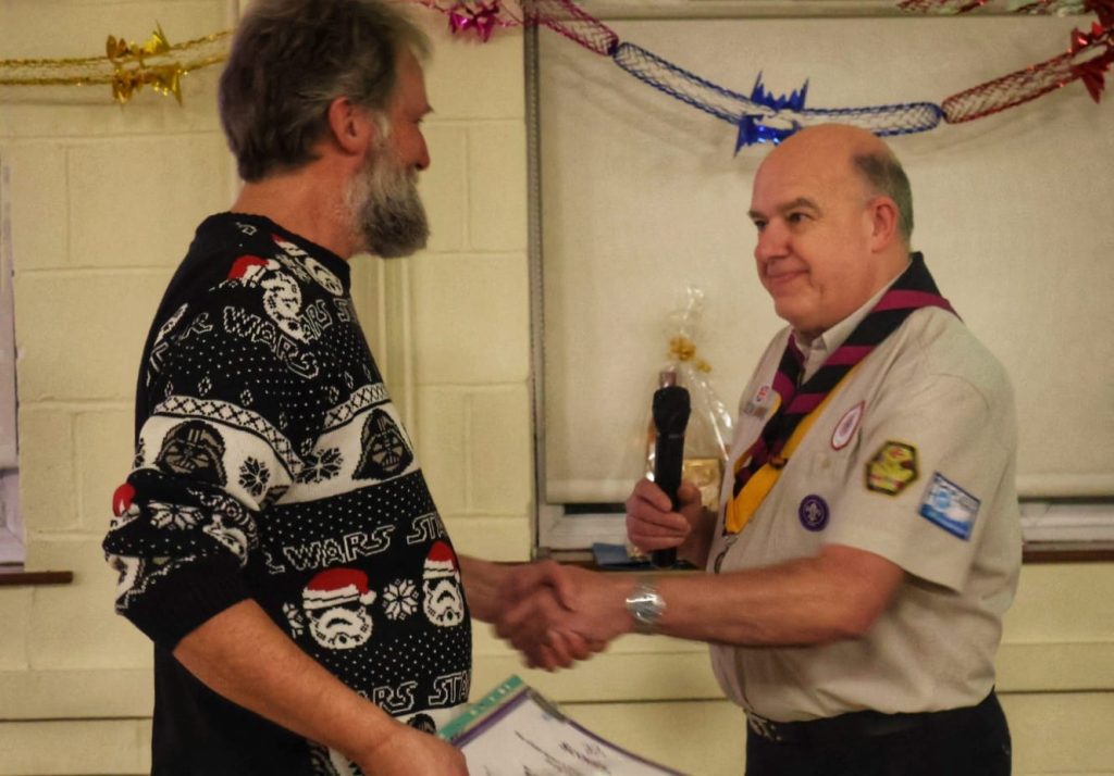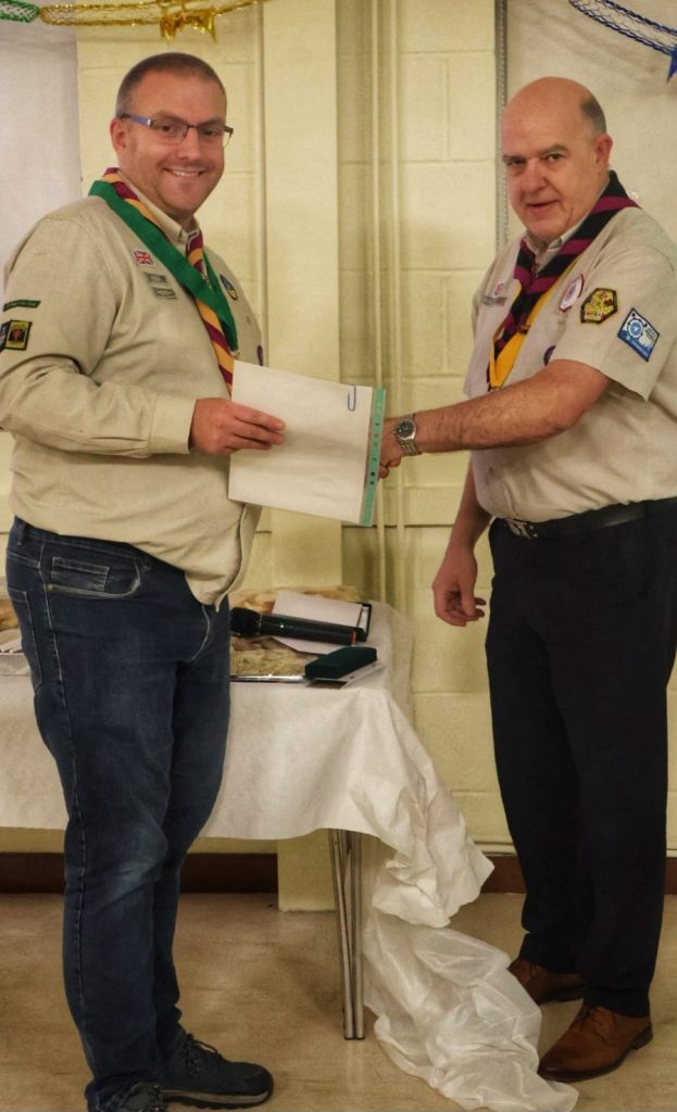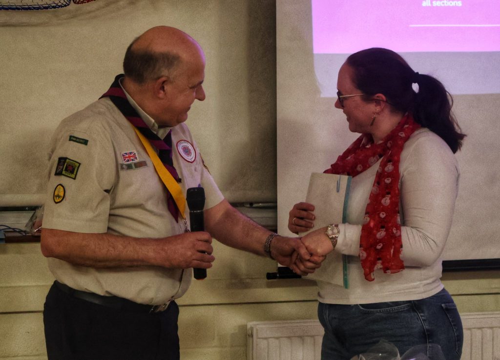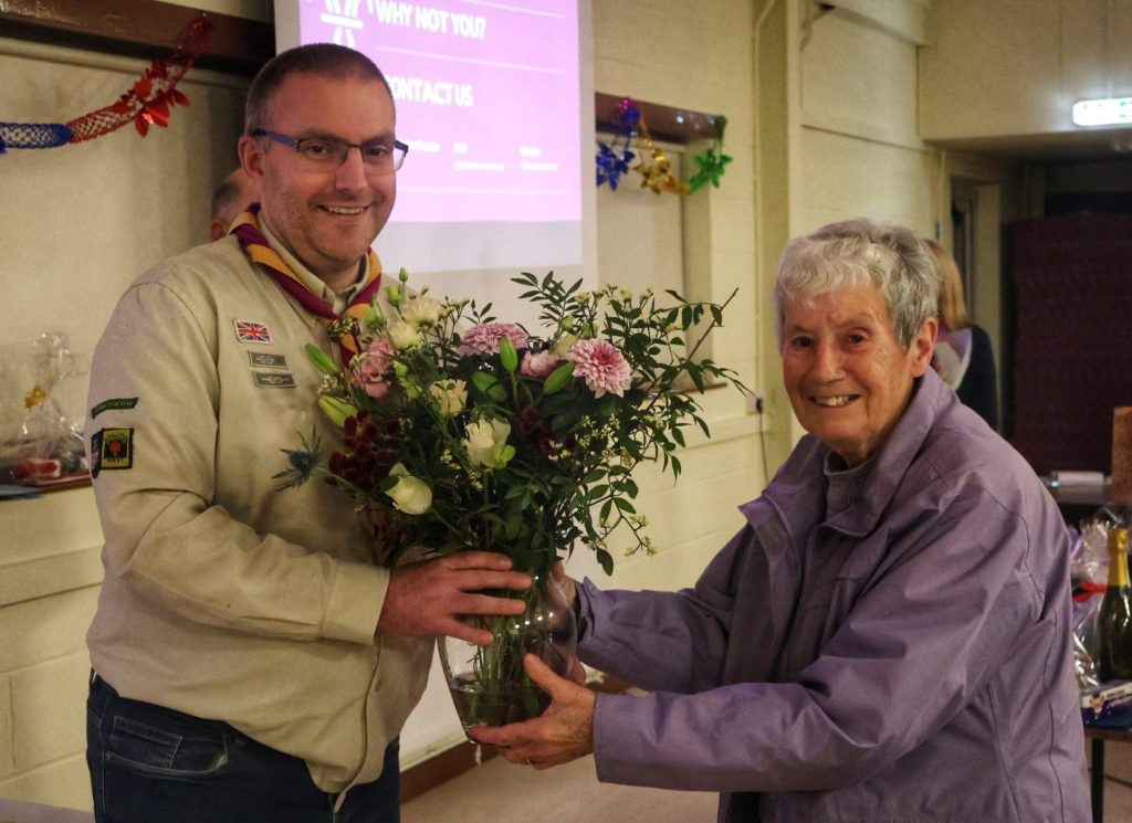 District Lead Jeff Picton joined the evening to present commendations to Kate, Neil and Noel whilst Linda was presented with her 40 year service award. Sarah was also presented with a vase and flowers as she steps back from leadering after 50 years service. Whilst our latest Cheif Scout Gold award earners were presented with their awards.